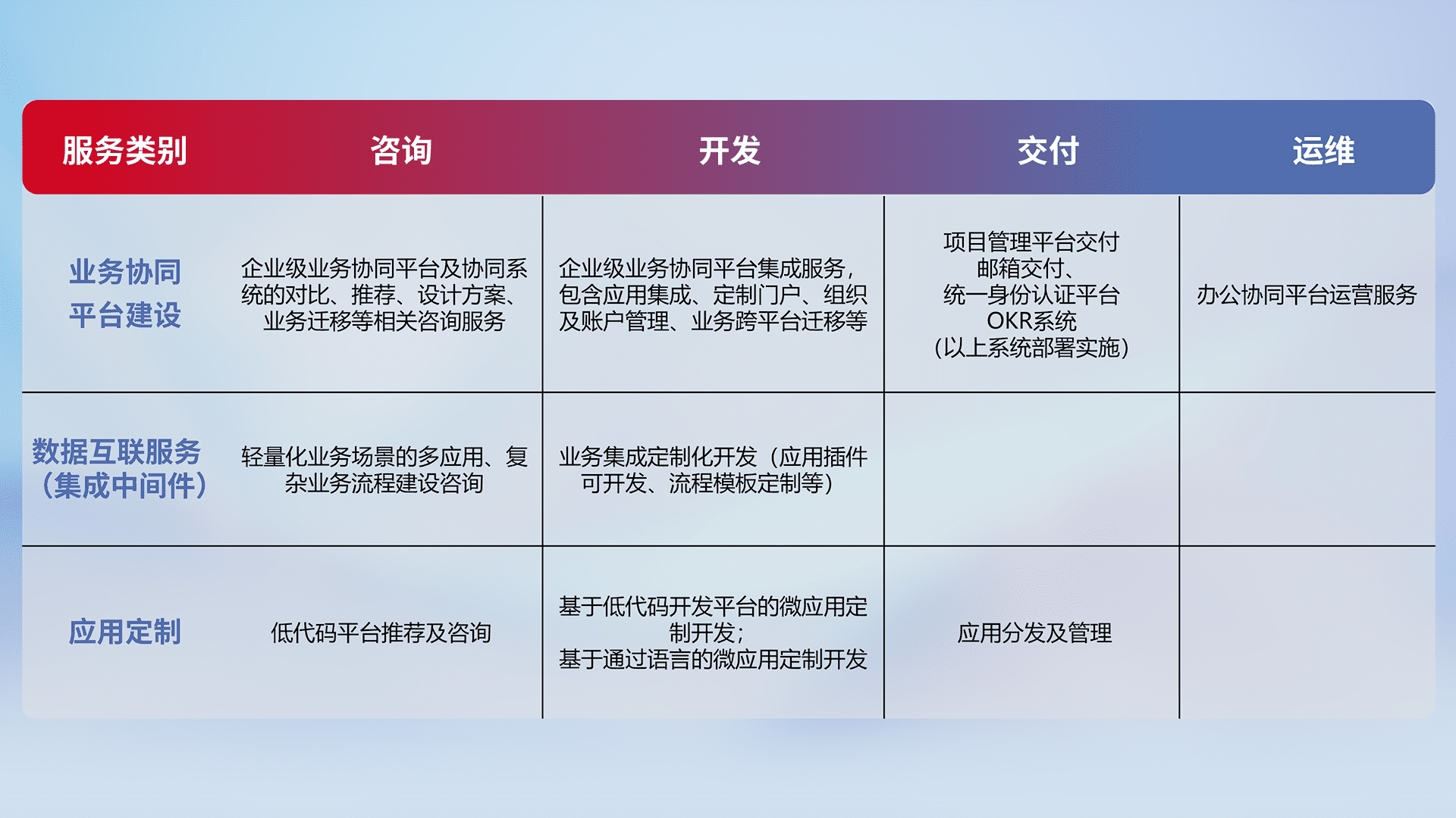 针对钉钉、、、、企微、、IDaas等平台级产品提供产品的规划、、方案、、交付、、、、定制化开发等服务,,,实现如统一协同办公、、智能客户服务、、混合会议管理、、智能数据查询、、等业务场景,,,实现数字化转型。。